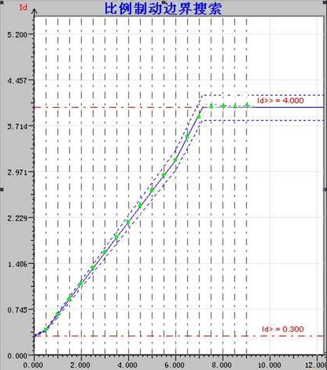完成上面的设值之后就可以直接开始试验了,此时如果是做PST-1200高对低压侧比例边界曲线相位调整方式就应该选择为高压侧调整了。制动电流与差动电流初值终值步长只会形象图的美观度,测试仪会自动的完成比例制动边界搜索,试验结果如图7所示:
